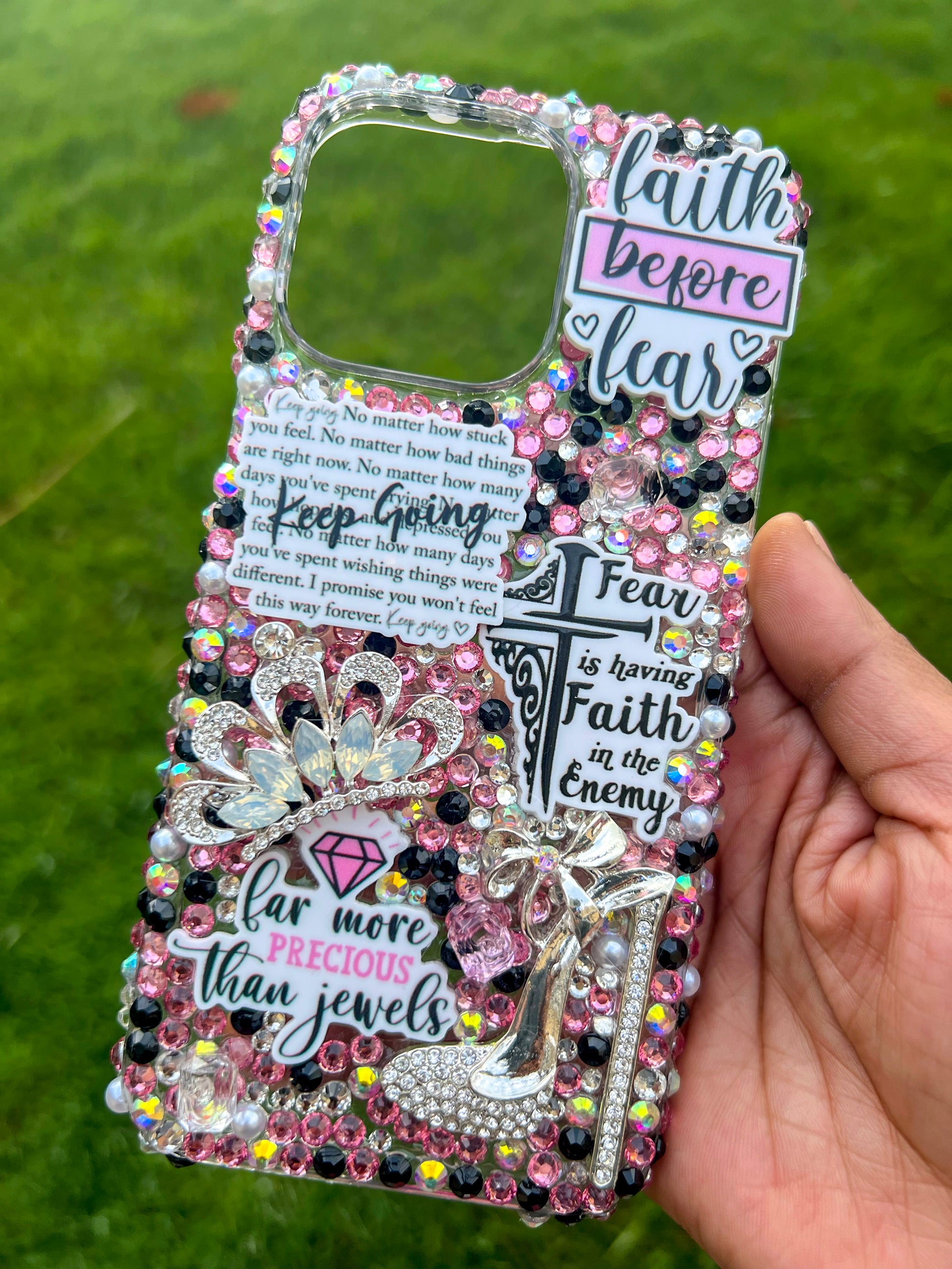 Showcase your faith with style using the Faith before Fear iPhone 15 Pro Max phone case. Embrace the sleek design and added bling while keeping your device being the showstopper in the room. All sales are final, so don't miss out on this perfect accessory!
